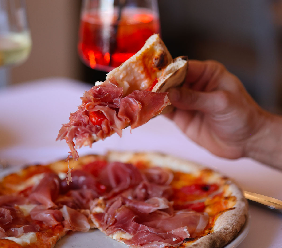 Il gusto è esaltato dalla fragranza della cottura nel forno a legna. L’impasto è realizzato con farina biologica, lievito naturale e una lenta lievitazione di almeno 24 ore, rendendolo altamente digeribile.